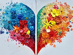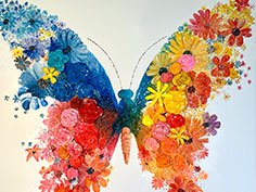 A vibrant butterfly, heart & tree art paintings, composed of intricate floral elements, blending vivid blues, pinks, oranges, and yellows. This artwork bursts with texture, color, and movement, symbolizing transformation, joy, and the beauty of nature in full bloom.